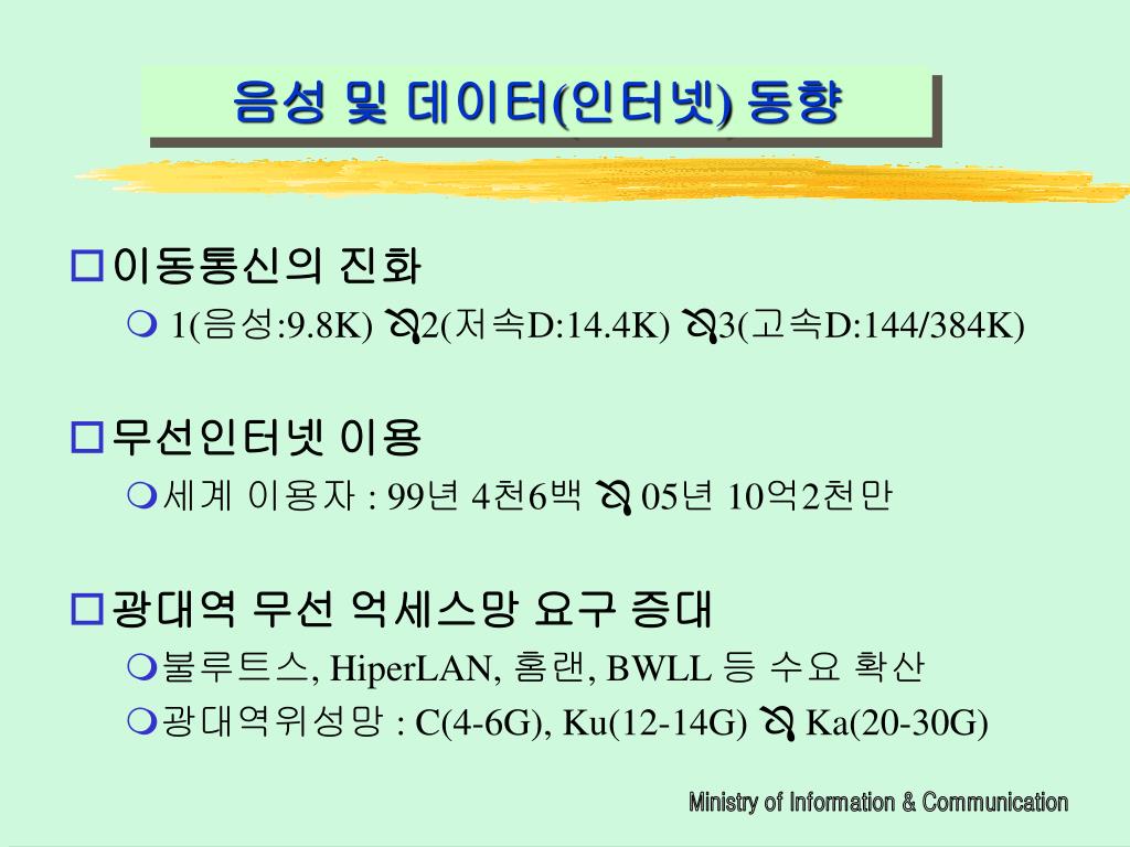 음성 및 데이터(인터넷) 동향 • 이동통신의 진화 • 1(음성:9.8K) 2(저속D:14.4K) 3(고속D:144/384K) • 무선인터넷 이용 • 세계 이용자 : 99년 4천6백 05년 10억2천만 • 광대역 무선 억세스망 요구 증대 • 불루트스, HiperLAN, 홈랜, BWLL 등 수요 확산 • 광대역위성망 : C(4-6G), Ku(12-14G) Ka(20-30G)