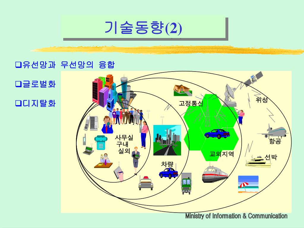 위성 고정통신 사무실 항공 구내 실외 교외지역 선박 차량 기술동향(2) • 유선망과 무선망의 융합 • 글로벌화 • 디지탈화