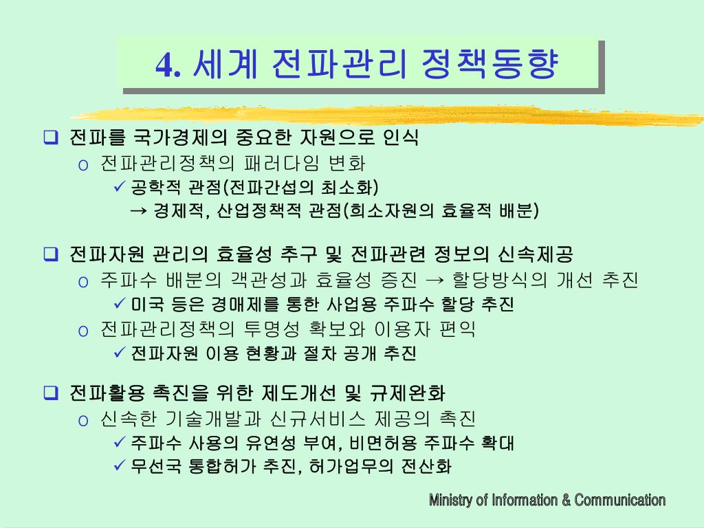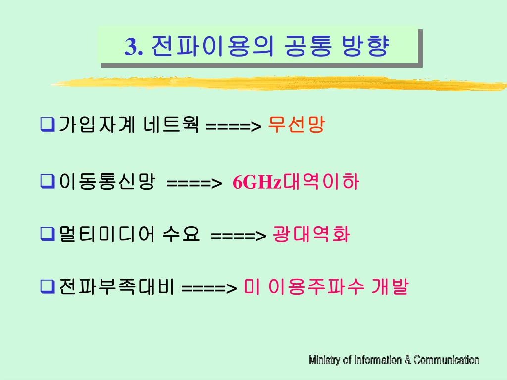3. 전파이용의 공통 방향 • 가입자계 네트웍 ====> 무선망 • 이동통신망 ====> 6GHz대역이하 • 멀티미디어 수요 ====> 광대역화 • 전파부족대비 ====> 미 이용주파수 개발