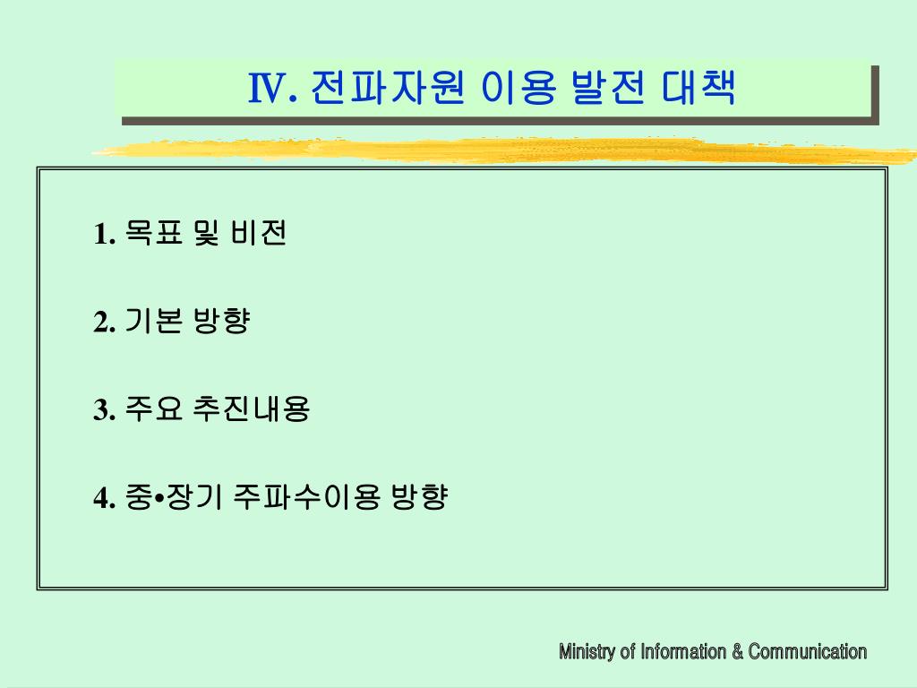 1. 목표 및 비젼 언제, 어디서나 인터넷이 되는 나라 유•무선 네트워크가 잘 구축된 나라 새로운 전파산업 창출이 활발한 나라 New WAVE 기반 달성 • 새로운 무선시장(Wireless Market) 확대 • 새로운 주파수 할당체제(Assignment of Frequency) 구축 • 새로운 주파수 가치(Value of Frequency) 창출 • 새로운 주파수이용 환경(Environment of Freq-Use) 구축