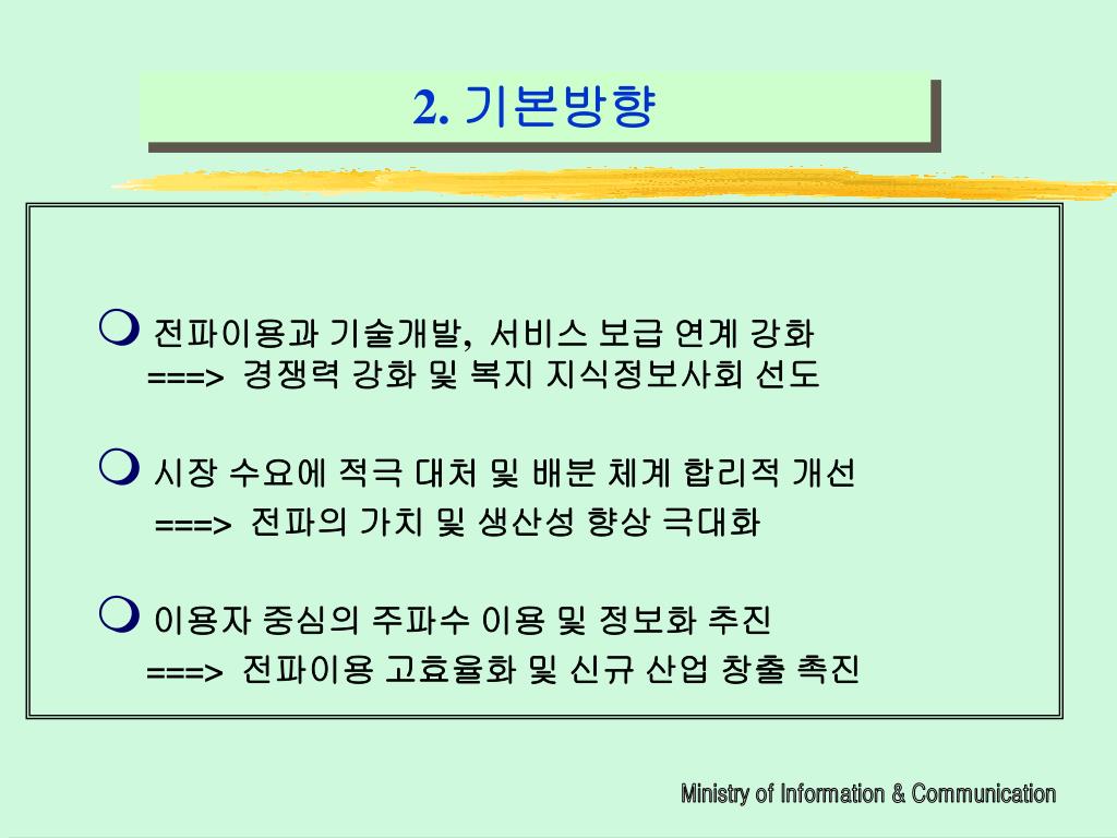 2. 기본방향 • 전파이용과 기술개발, 서비스 보급 연계 강화 ===> 경쟁력 강화 및 복지 지식정보사회 선도 • 시장 수요에 적극 대처 및 배분 체계 합리적 개선 ===> 전파의 가치 및 생산성 향상 극대화 • 이용자 중심의 주파수 이용 및 정보화 추진 ===> 전파이용 고효율화 및 신규 산업 창출 촉진