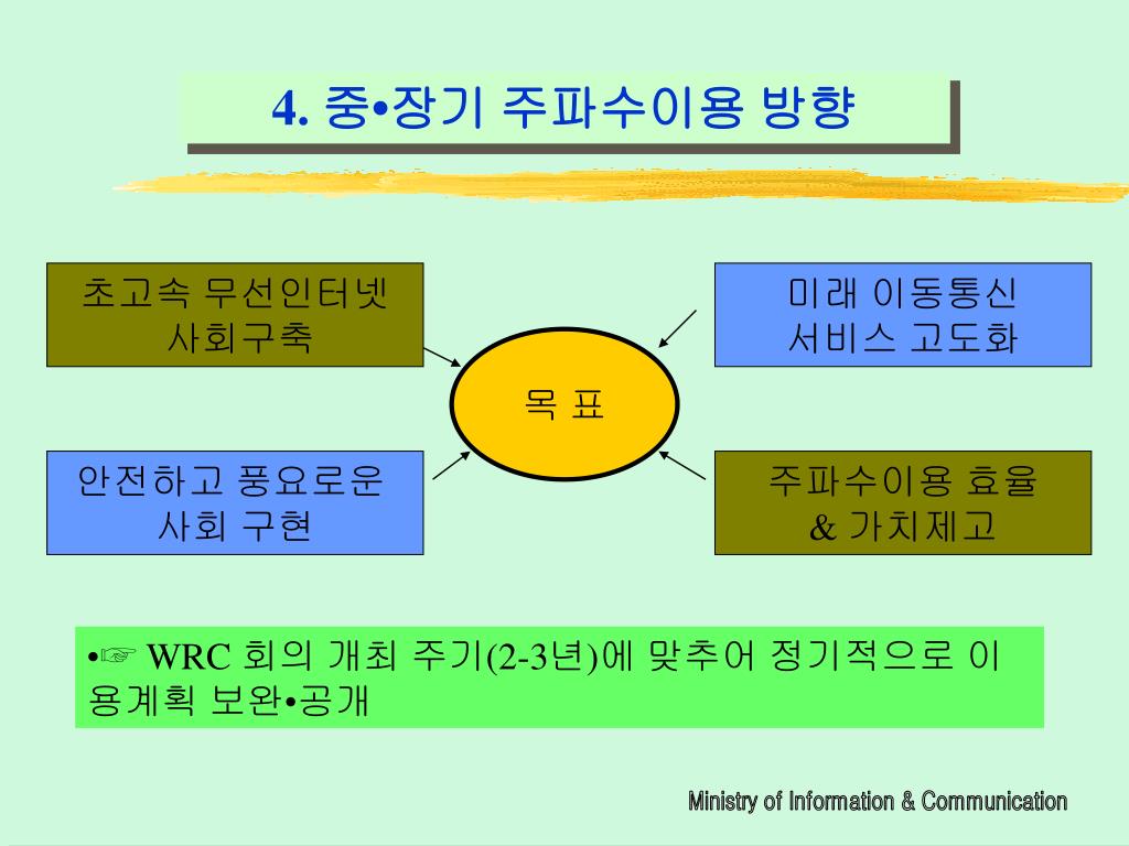 4. 중•장기 주파수이용 방향 초고속 무선인터넷 사회구축 미래 이동통신 서비스 고도화 목 표 안전하고 풍요로운 사회 구현 주파수이용 효율 & 가치제고 • ☞ WRC 회의 개최 주기(2-3년)에 맞추어 정기적으로 이용계획 보완•공개