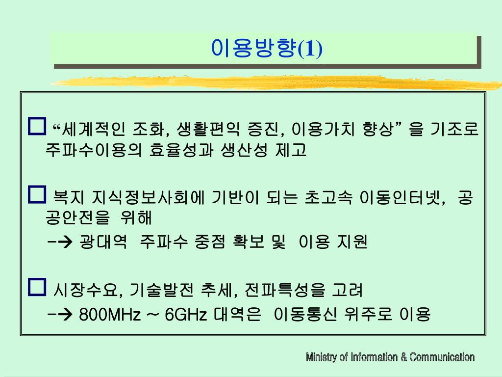 이용방향(1) • “세계적인 조화, 생활편익 증진, 이용가치 향상” 을 기조로 주파수이용의 효율성과 생산성 제고 • 복지 지식정보사회에 기반이 되는 초고속 이동인터넷, 공공안전을 위해 - 광대역 주파수 중점 확보 및 이용 지원 • 시장수요, 기술발전 추세, 전파특성을 고려 - 800MHz ~ 6GHz 대역은 이동통신 위주로 이용