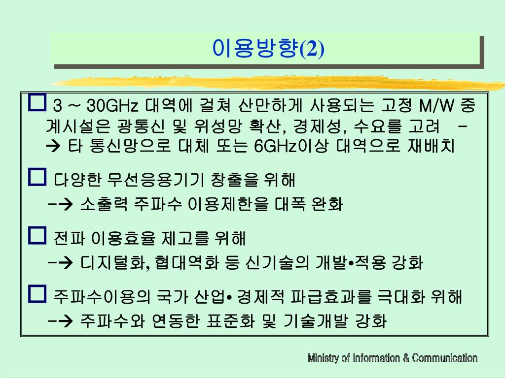 이용방향(2) • 3 ~ 30GHz 대역에 걸쳐 산만하게 사용되는 고정 M/W 중계시설은 광통신 및 위성망 확산, 경제성, 수요를 고려 - 타 통신망으로 대체 또는 6GHz이상 대역으로 재배치 • 다양한 무선응용기기 창출을 위해 - 소출력 주파수 이용제한을 대폭 완화 • 전파 이용효율 제고를 위해 - 디지털화, 협대역화 등 신기술의 개발•적용 강화 • 주파수이용의 국가 산업• 경제적 파급효과를 극대화 위해 - 주파수와 연동한 표준화 및 기술개발 강화