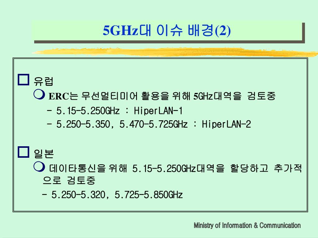 5GHz대 이슈 배경(2) • 유럽 • ERC는 무선멀티미어 활용을 위해 5GHz대역을 검토중 - 5.15-5.250GHz : HiperLAN-1 - 5.250-5.350, 5.470-5.725GHz : HiperLAN-2 • 일본 • 데이타통신을 위해 5.15-5.250GHz대역을 할당하고 추가적으로 검토중 - 5.250-5.320, 5.725-5.850GHz