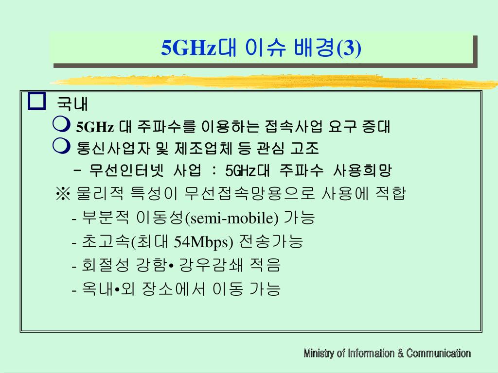 5GHz대 이슈 배경(3) • 국내 • 5GHz 대 주파수를 이용하는 접속사업 요구 증대 • 통신사업자 및 제조업체 등 관심 고조 - 무선인터넷 사업 : 5GHz대 주파수 사용희망 ※ 물리적 특성이 무선접속망용으로 사용에 적합 - 부분적 이동성(semi-mobile) 가능 - 초고속(최대 54Mbps) 전송가능 - 회절성 강함• 강우감쇄 적음 - 옥내•외 장소에서 이동 가능
