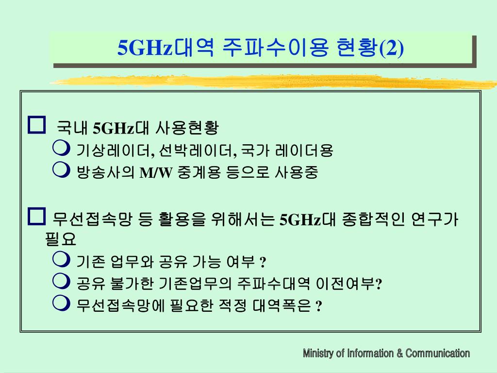 5GHz대 주파수 이용 정책 방향 2001. 10. 5 정보통신부 전파방송관리국 이 재 홍 (http://home.mic.go.kr/~spectrum/) Ministry of Information & Communication