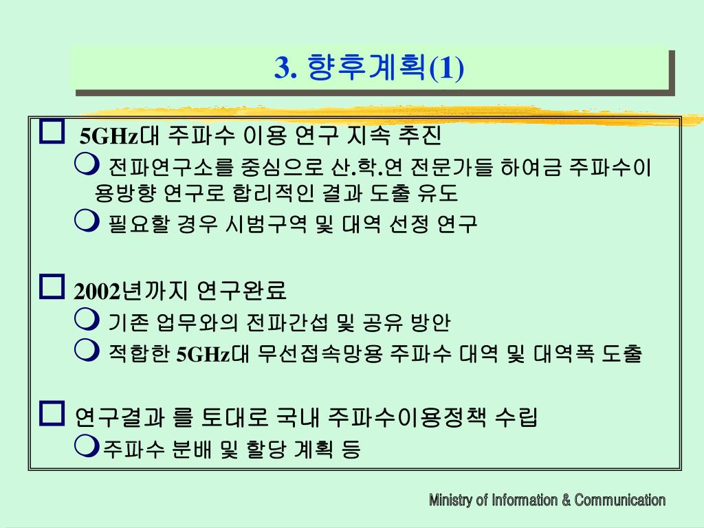 3. 향후계획(1) • 5GHz대 주파수 이용 연구 지속 추진 • 전파연구소를 중심으로 산.학.연 전문가들 하여금 주파수이용방향 연구로 합리적인 결과 도출 유도 • 필요할 경우 시범구역 및 대역 선정 연구 • 2002년까지 연구완료 • 기존 업무와의 전파간섭 및 공유 방안 • 적합한 5GHz대 무선접속망용 주파수 대역 및 대역폭 도출 • 연구결과 를 토대로 국내 주파수이용정책 수립 • 주파수 분배 및 할당 계획 등