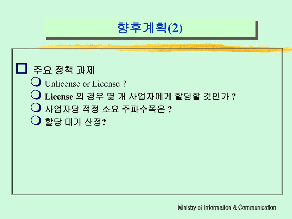 향후계획(2) • 주요 정책 과제 • Unlicense or License ? • License 의 경우 몇 개 사업자에게 할당할 것인가 ? • 사업자당 적정 소요 주파수폭은 ? • 할당 대가 산정?