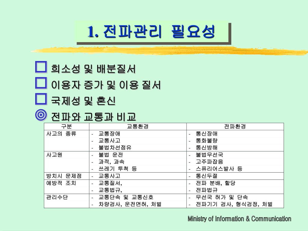 1. 전파관리 필요성 • 희소성 및 배분질서 • 이용자 증가 및 이용 질서 • 국제성 및 혼신 • 전파와 교통과 비교