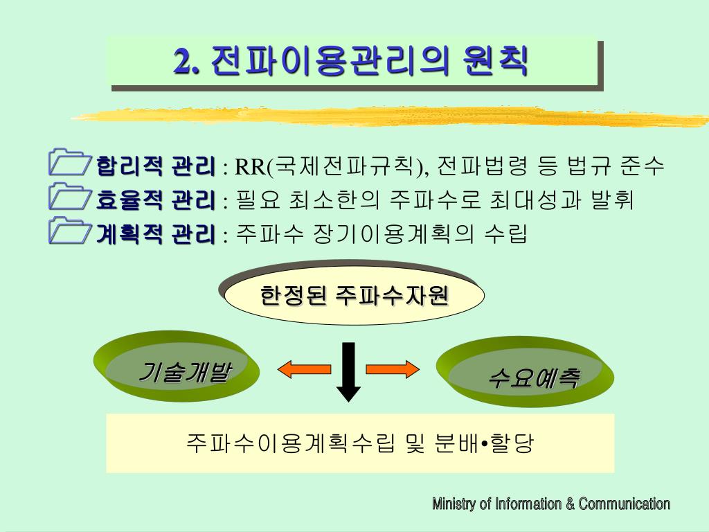 2. 전파이용관리의 원칙 • 합리적 관리: RR(국제전파규칙), 전파법령 등 법규 준수 • 효율적 관리: 필요 최소한의 주파수로 최대성과 발휘 • 계획적 관리: 주파수 장기이용계획의 수립 한정된 주파수자원 기술개발 수요예측 주파수이용계획수립 및 분배•할당