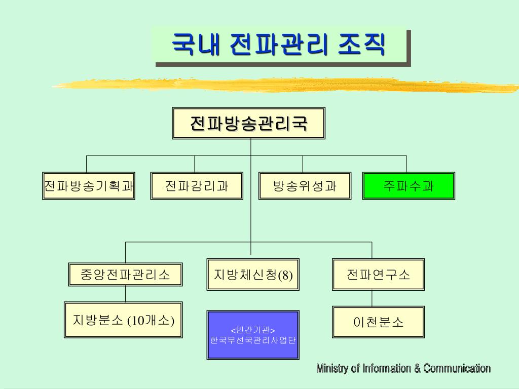 전파방송관리국 전파방송기획과 전파감리과 방송위성과 주파수과 지방체신청(8) 전파연구소 중앙전파관리소 지방분소 (10개소) 이천분소 <민간기관> 한국무선국관리사업단 국내 전파관리 조직