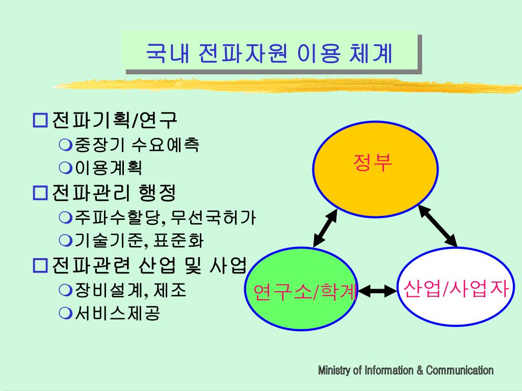 국내 전파자원 이용 체계 • 전파기획/연구 • 중장기 수요예측 • 이용계획 • 전파관리 행정 • 주파수할당, 무선국허가 • 기술기준, 표준화 • 전파관련 산업 및 사업 • 장비설계, 제조 • 서비스제공 정부 산업/사업자 연구소/학계