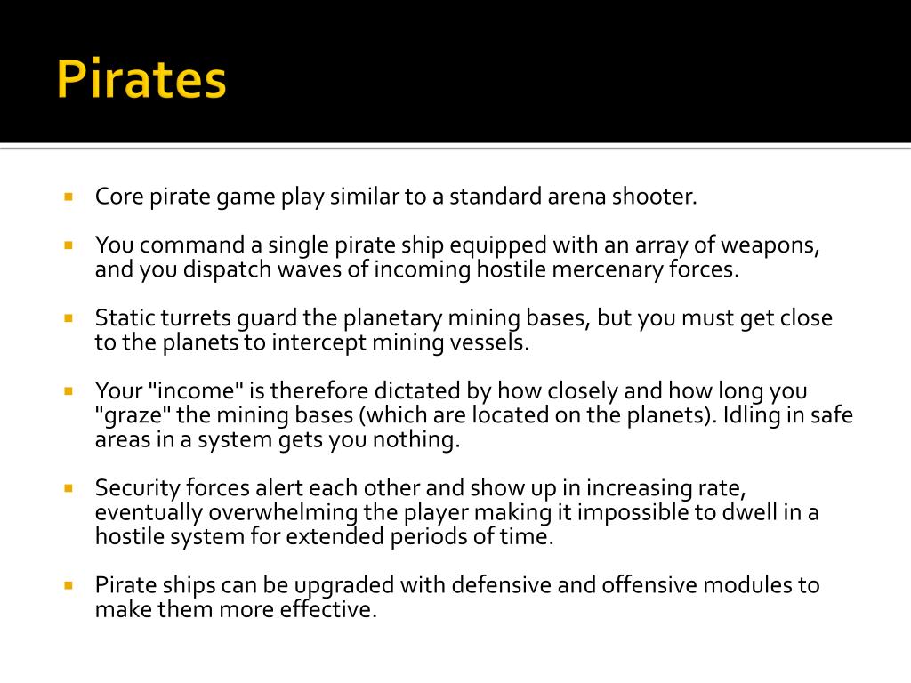 Pirates • Core pirate game play similar to a standard arena shooter. • You command a single pirate ship equipped with an array of weapons, and you dispatch waves of incoming hostile mercenary forces. • Static turrets guard the planetary mining bases, but you must get close to the planets to intercept mining vessels. • Your "income" is therefore dictated by how closely and how long you "graze" the mining bases (which are located on the planets). Idling in safe areas in a system gets you nothing. • Security forces alert each other and show up in increasing rate, eventually overwhelming the player making it impossible to dwell in a hostile system for extended periods of time. • Pirate ships can be upgraded with defensive and offensive modules to make them more effective.