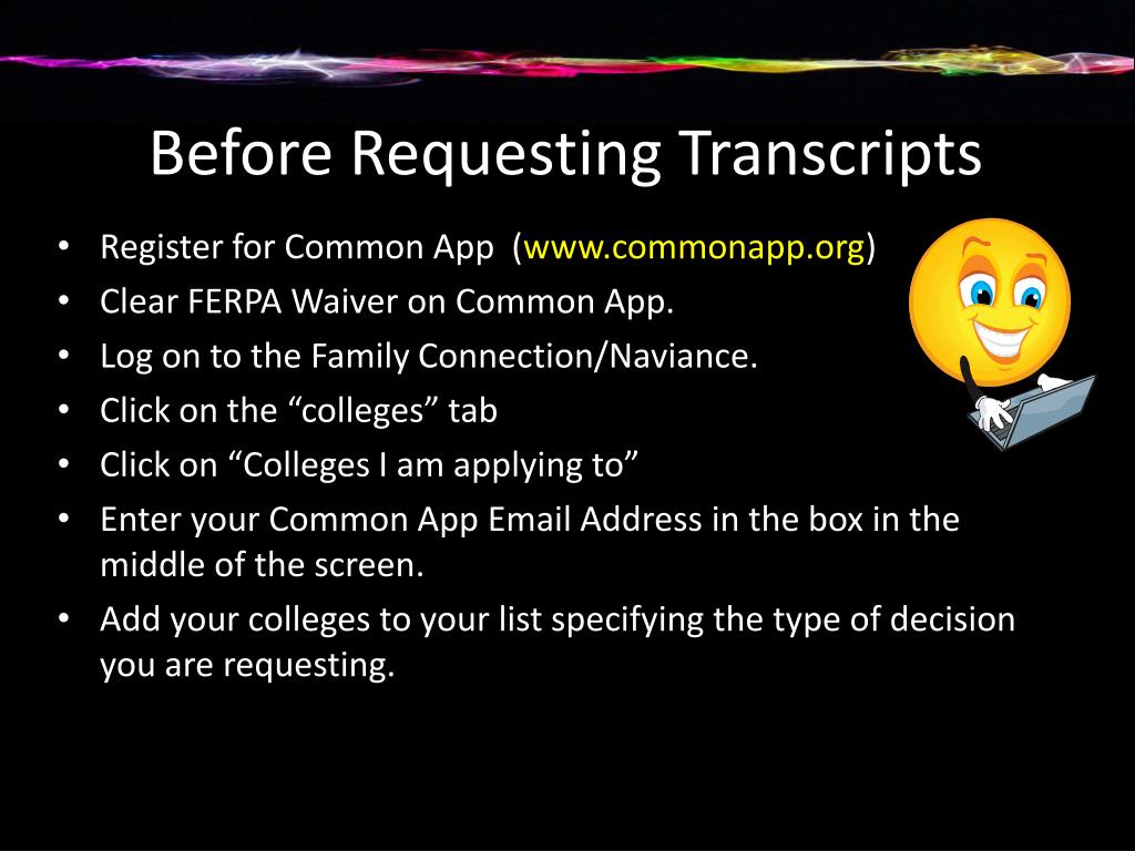 Before Requesting Transcripts • Register for Common App (www.commonapp.org) • Clear FERPA Waiver on Common App. • Log on to the Family Connection/Naviance. • Click on the “colleges” tab • Click on “Colleges I am applying to” • Enter your Common App Email Address in the box in the middle of the screen. • Add your colleges to your list specifying the type of decision you are requesting.