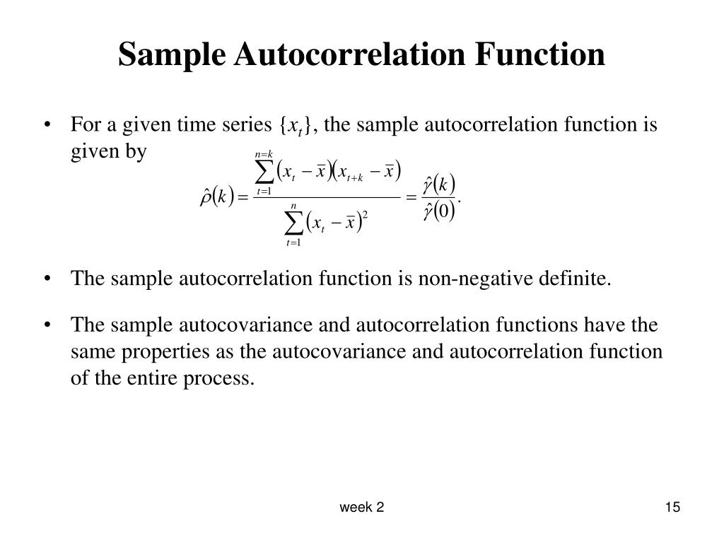 Sample Autocorrelation Function • For a given time series {xt}, the sample autocorrelation function is given by • The sample autocorrelation function is non-negative definite. • The sample autocovariance and autocorrelation functions have the same properties as the autocovariance and autocorrelation function of the entire process. week 2
