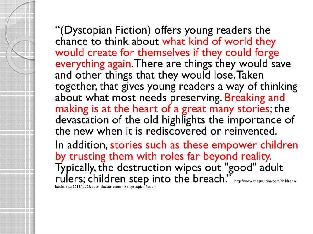 “(Dystopian Fiction) offers young readers the chance to think about what kind of world they would create for themselves if they could forge everything again. There are things they would save and other things that they would lose. Taken together, that gives young readers a way of thinking about what most needs preserving. Breaking and making is at the heart of a great many stories; the devastation of the old highlights the importance of the new when it is rediscovered or reinvented. In addition, stories such as these empower children by trusting them with roles far beyond reality. Typically, the destruction wipes out "good" adult rulers; children step into the breach.” http://www.theguardian.com/childrens-books-site/2013/jul/08/book-doctor-teens-like-dystopian-fiction