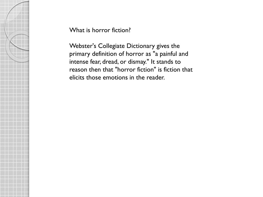 What is horror fiction? Webster's Collegiate Dictionary gives the primary definition of horror as "a painful and intense fear, dread, or dismay." It stands to reason then that "horror fiction" is fiction that elicits those emotions in the reader.