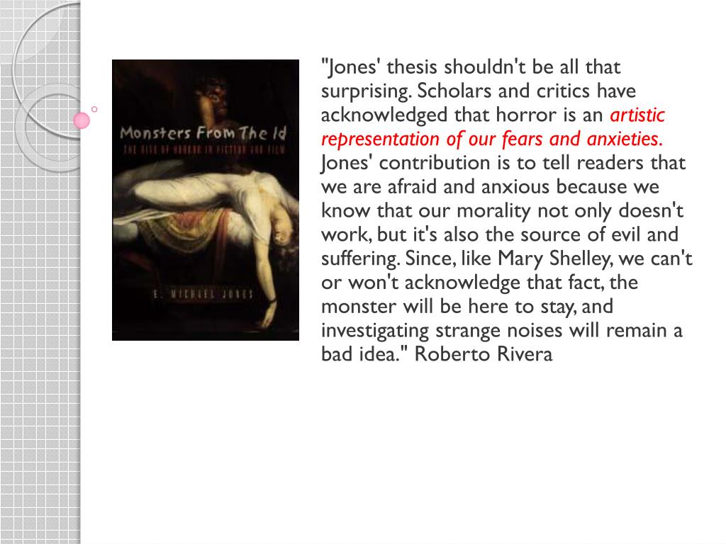 "Jones' thesis shouldn't be all that surprising. Scholars and critics have acknowledged that horror is an artistic representation of our fears and anxieties. Jones' contribution is to tell readers that we are afraid and anxious because we know that our morality not only doesn't work, but it's also the source of evil and suffering. Since, like Mary Shelley, we can't or won't acknowledge that fact, the monster will be here to stay, and investigating strange noises will remain a bad idea." Roberto Rivera