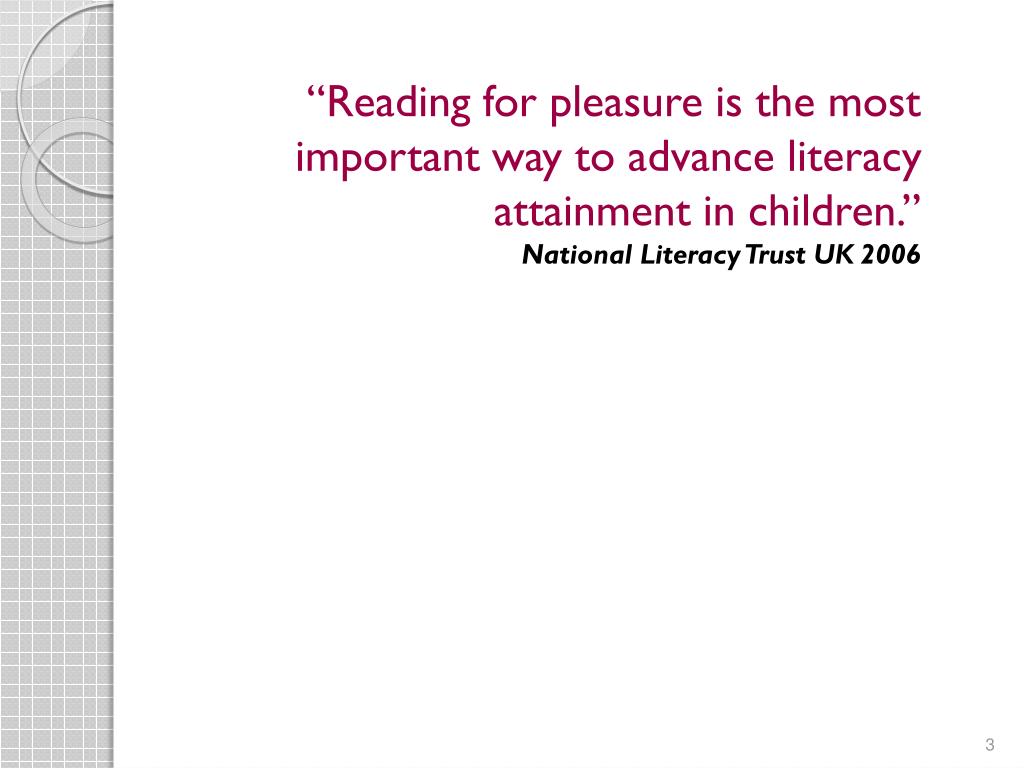 “Reading for pleasure is the most important way to advance literacy attainment in children.” National Literacy Trust UK 2006