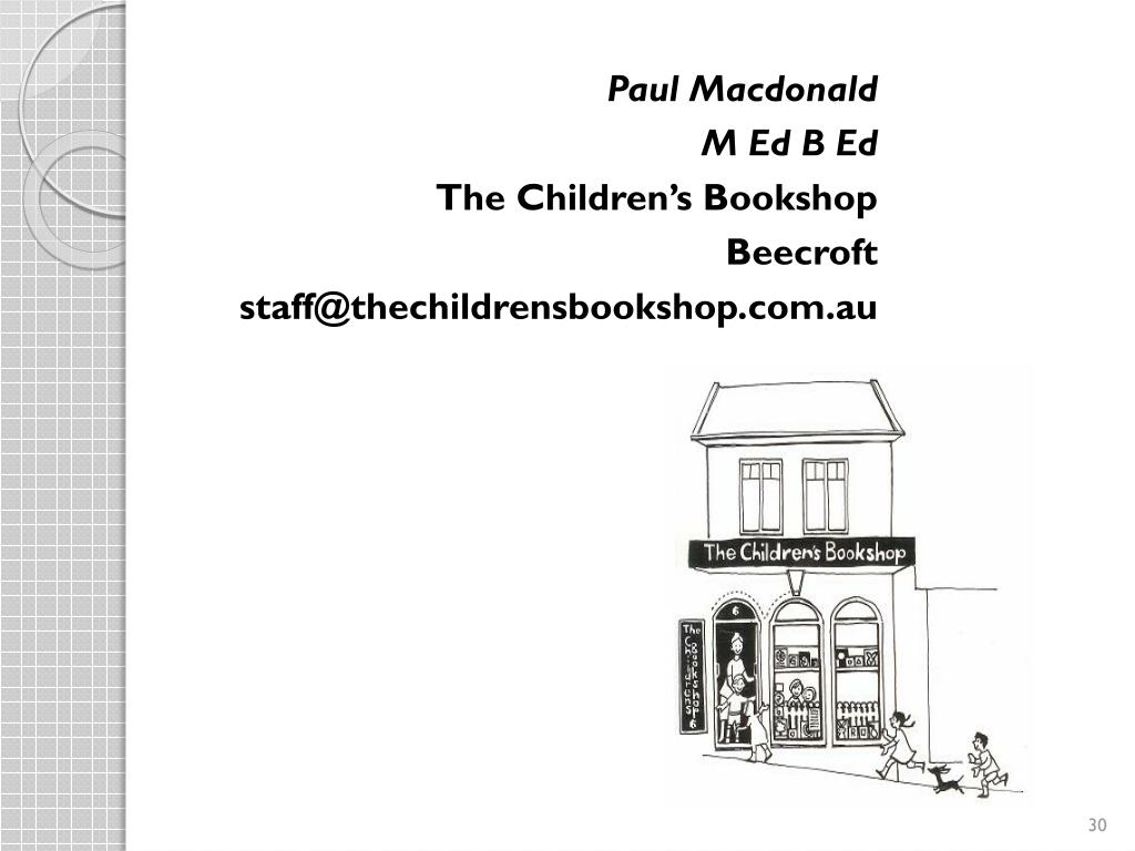 Paul Macdonald M Ed B Ed The Children’s Bookshop Beecroft staff@thechildrensbookshop.com.au