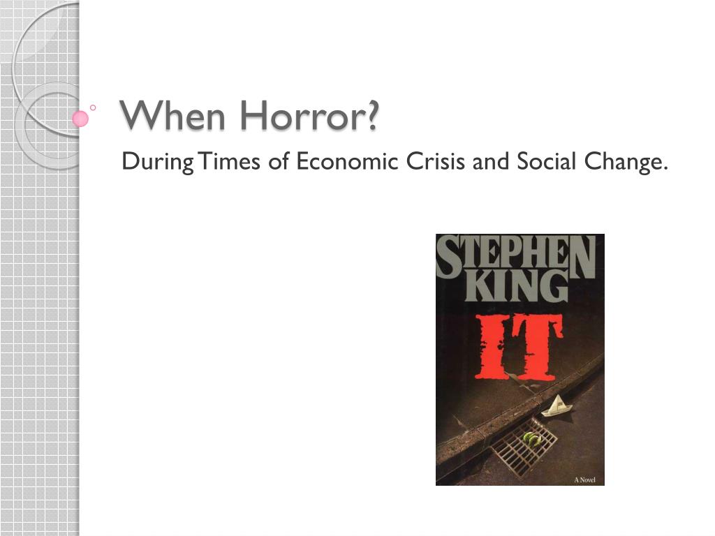 Value of Horror? • Great uses of language TRUE! --nervous --very, very dreadfully nervous I had been and am; but why will you say that I am mad? The disease had sharpened my senses --not destroyed --not dulled them. Above all was the sense of hearing acute. I heard all things in the heaven and in the earth. I heard many things in hell. How, then, am I mad? Hearken! and observe how healthily --how calmly I can tell you the whole story.