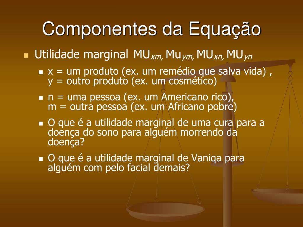 Componentes da Equação • Utilidade marginalMUxm, Muym, MUxn, MUyn • x = um produto (ex. um remédio que salva vida) , y = outro produto (ex. um cosmético) • n = uma pessoa (ex. um Americano rico), m = outra pessoa (ex. um Africano pobre) • O que é a utilidade marginal de uma cura para a doença do sono para alguém morrendo da doença? • O que é a utilidade marginal de Vaniqa para alguém com pelo facial demais?