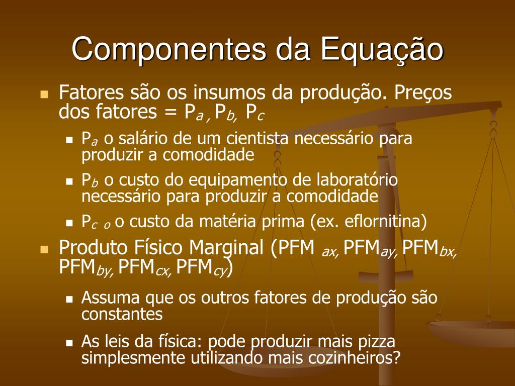 Componentes da Equação • Fatores são os insumos da produção. Preços dos fatores = Pa , Pb, Pc • Pa o salário de um cientista necessário para produzir a comodidade • Pb o custo do equipamento de laboratório necessário para produzir a comodidade • Pc oo custo da matéria prima (ex. eflornitina) • Produto Físico Marginal (PFM ax, PFMay, PFMbx, PFMby, PFMcx, PFMcy) • Assuma que os outros fatores de produção são constantes • As leis da física: pode produzir mais pizza simplesmente utilizando mais cozinheiros?