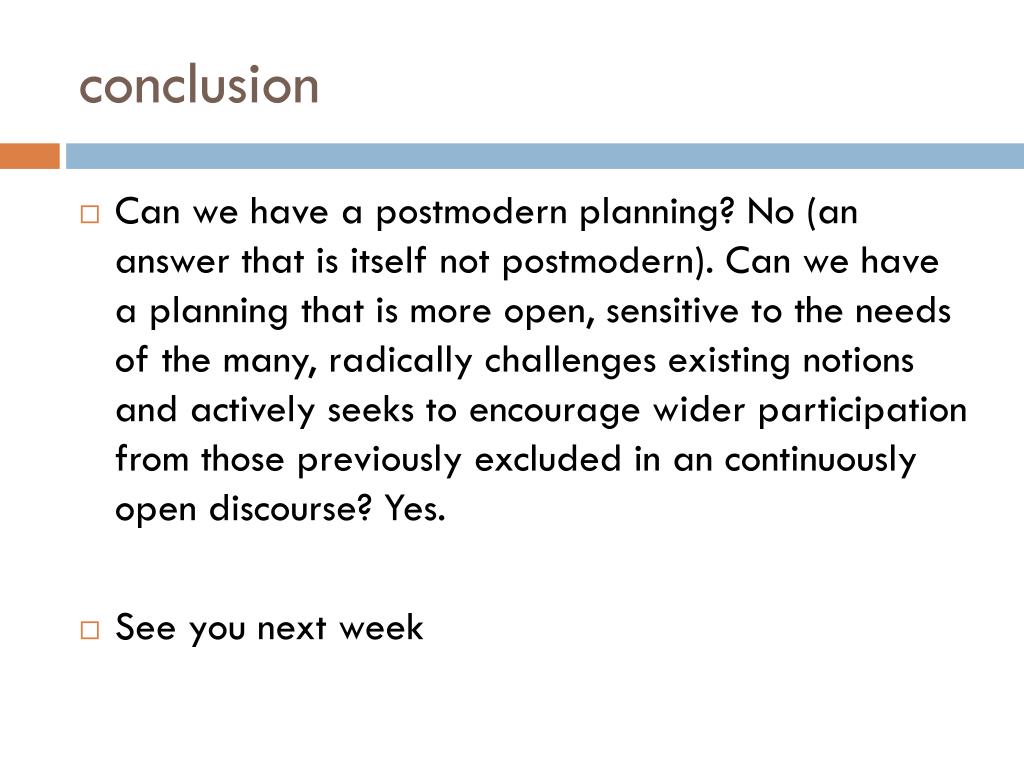 conclusion • Can we have a postmodern planning? No (an answer that is itself not postmodern). Can we have a planning that is more open, sensitive to the needs of the many, radically challenges existing notions and actively seeks to encourage wider participation from those previously excluded in an continuously open discourse? Yes. • See you next week