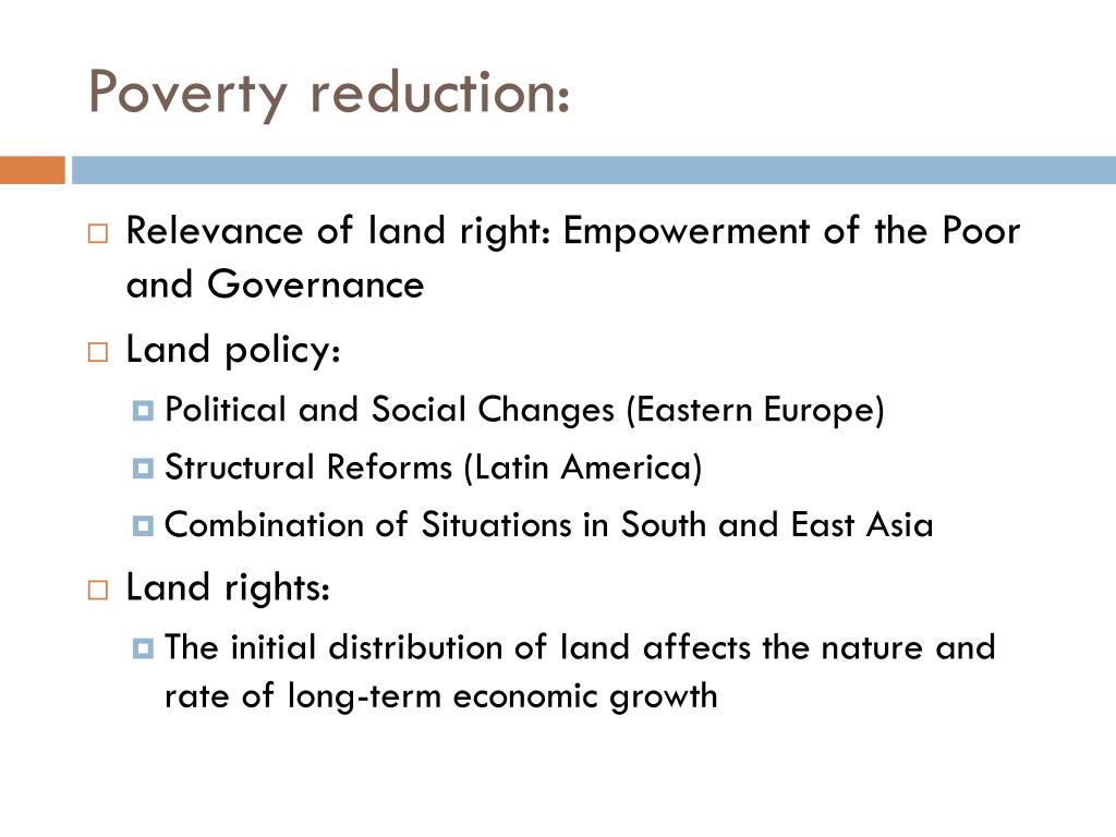 Poverty reduction: • Relevance of land right: Empowerment of the Poor and Governance • Land policy: • Political and Social Changes (Eastern Europe) • Structural Reforms (Latin America) • Combination of Situations in South and East Asia • Land rights: • The initial distribution of land affects the nature and rate of long-termeconomic growth