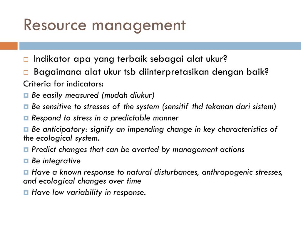 Resource management • Indikator apa yang terbaik sebagai alat ukur? • Bagaimana alat ukur tsb diinterpretasikan dengan baik? Criteria for indicators: • Be easily measured (mudah diukur) • Be sensitive to stresses of the system (sensitif thd tekanan dari sistem) • Respond to stress in a predictable manner • Be anticipatory: signify an impending change in key characteristics of the ecological system. • Predict changes that can be averted by management actions • Be integrative • Have a known response to natural disturbances, anthropogenic stresses, and ecological changes over time • Have low variability in response.