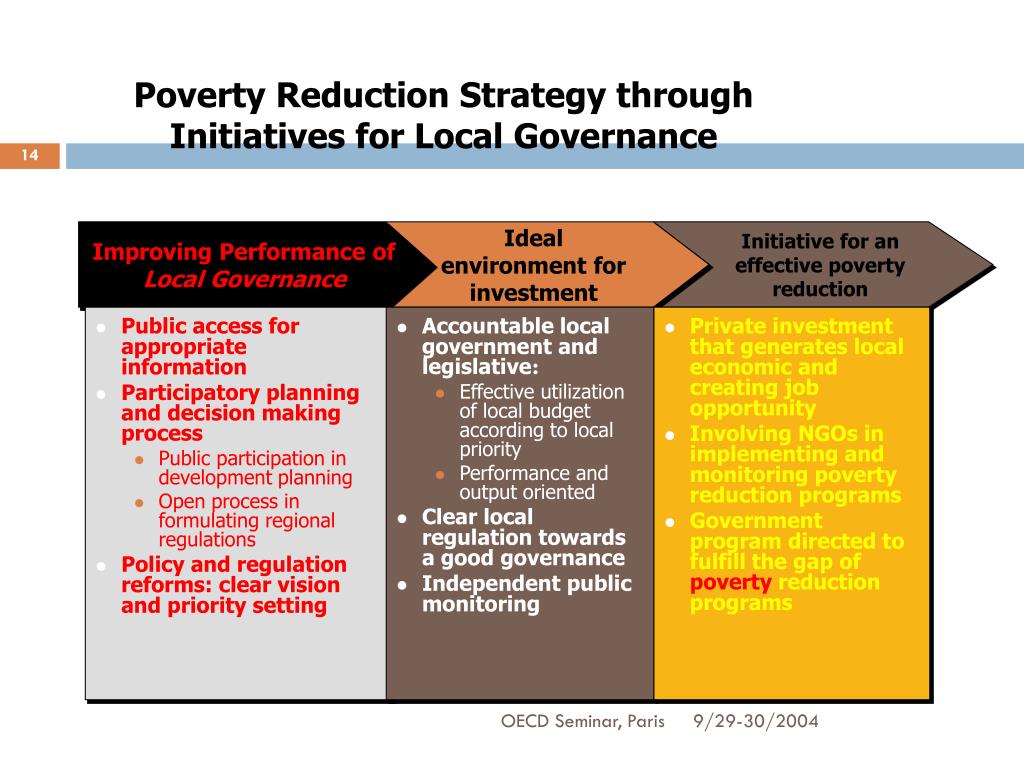 Poverty Reduction Strategy through Initiatives for Local Governance Improving Performance of Local Governance Ideal environment for investment Initiative for an effective poverty reduction • Public access for appropriate information • Participatory planning and decision making process • Public participation in development planning • Open process in formulating regional regulations • Policy and regulation reforms: clear vision and priority setting • Accountable local government and legislative: • Effective utilization of local budget according to local priority • Performance and output oriented • Clear local regulation towards a good governance • Independent public monitoring • Private investment that generates local economic and creating job opportunity • Involving NGOs in implementing and monitoring poverty reduction programs • Government program directed to fulfill the gap of poverty reduction programs OECD Seminar, Paris