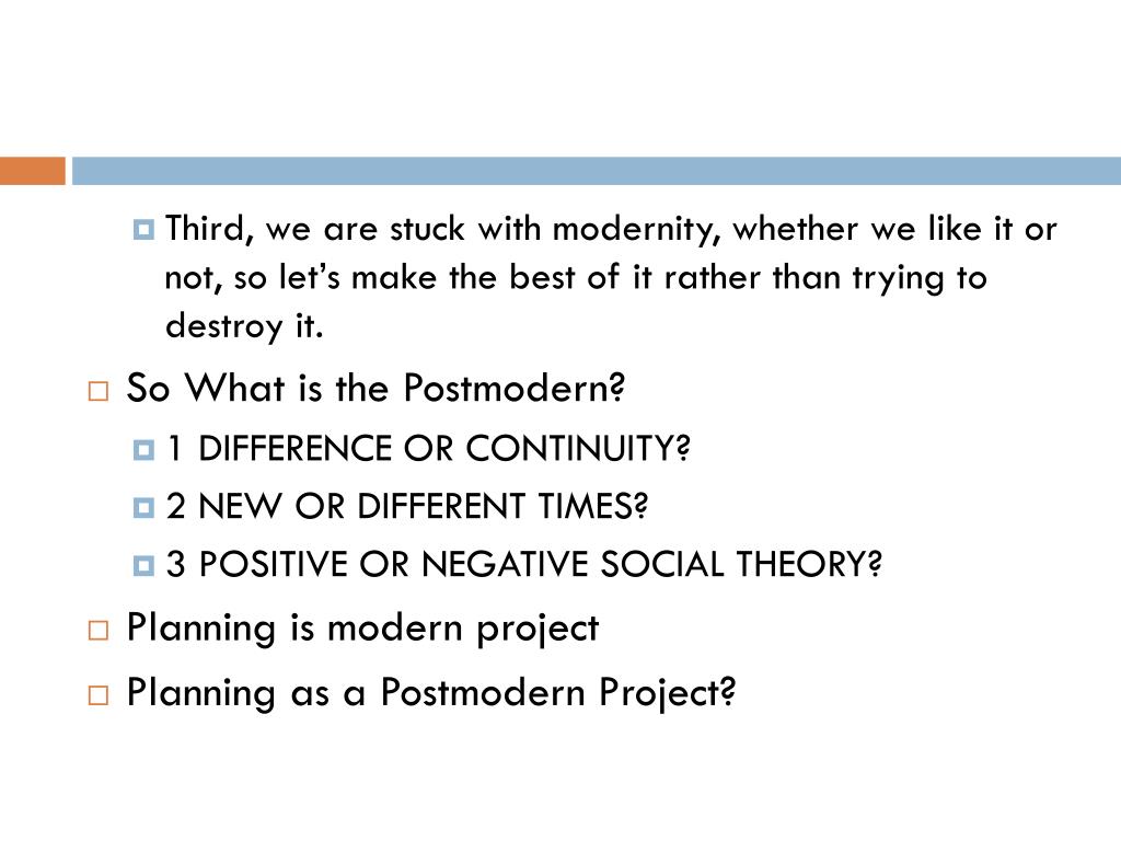 Third, we are stuck with modernity, whether we like it or not, so let’s make the best of it rather than trying to destroy it. • So What is the Postmodern? • 1 DIFFERENCE OR CONTINUITY? • 2 NEW OR DIFFERENT TIMES? • 3 POSITIVE OR NEGATIVE SOCIAL THEORY? • Planning is modern project • Planning as a Postmodern Project?