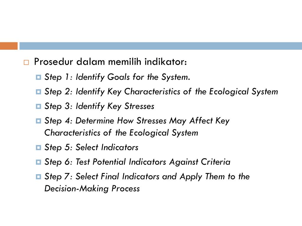 Prosedur dalam memilih indikator: • Step 1: Identify Goals for the System. • Step 2: Identify Key Characteristics of the Ecological System • Step 3: Identify Key Stresses • Step 4: Determine How Stresses May Affect Key Characteristics of the Ecological System • Step 5: Select Indicators • Step 6: Test Potential Indicators Against Criteria • Step 7: Select Final Indicators and Apply Them to the Decision-Making Process