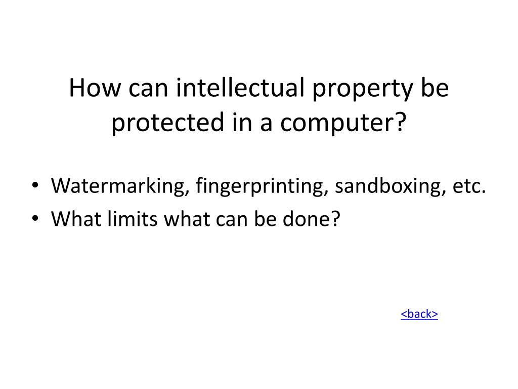 How can intellectual property be protected in a computer? • Watermarking, fingerprinting, sandboxing, etc. • What limits what can be done? <back>