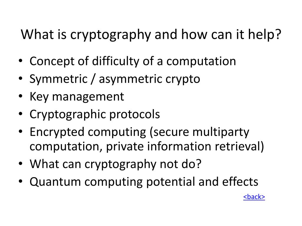 What is cryptography and how can it help? • Concept of difficulty of a computation • Symmetric / asymmetric crypto • Key management • Cryptographic protocols • Encrypted computing (secure multiparty computation, private information retrieval) • What can cryptography not do? • Quantum computing potential and effects <back>