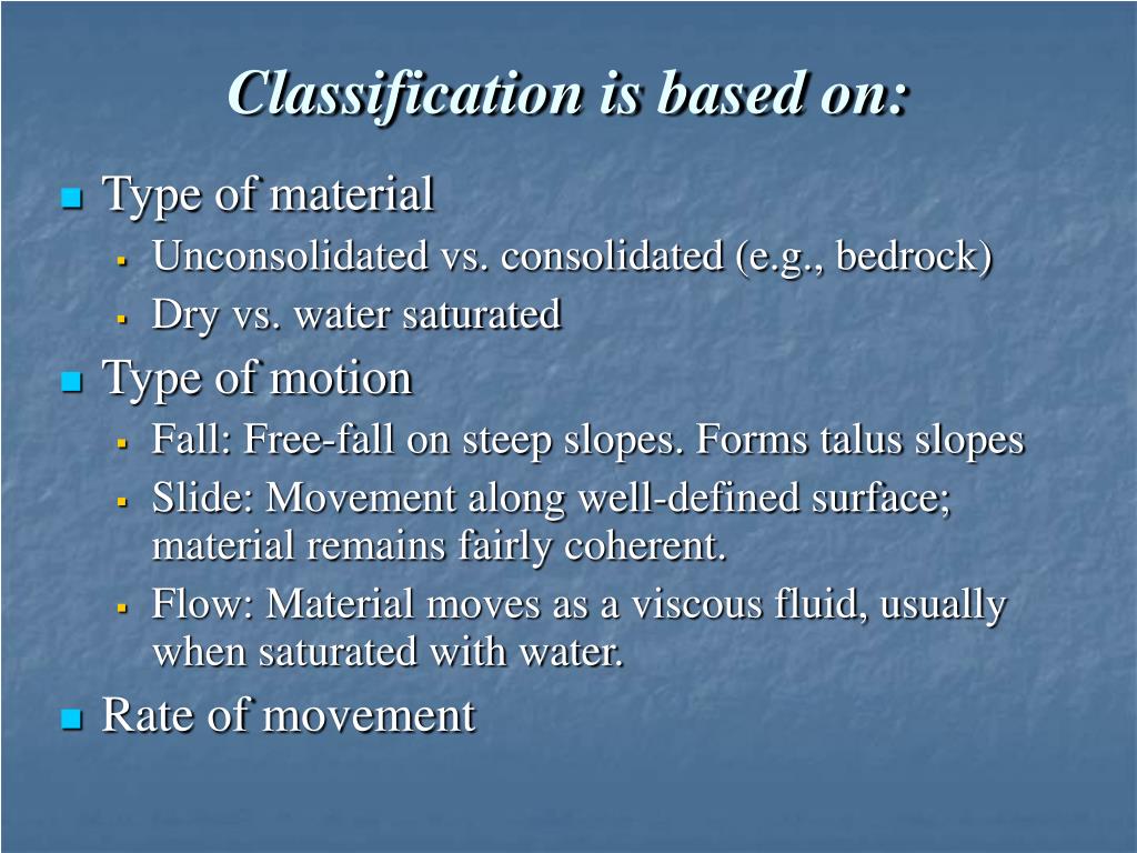 Classification is based on: • Type of material • Unconsolidated vs. consolidated (e.g., bedrock) • Dry vs. water saturated • Type of motion • Fall: Free-fall on steep slopes. Forms talus slopes • Slide: Movement along well-defined surface; material remains fairly coherent. • Flow: Material moves as a viscous fluid, usually when saturated with water. • Rate of movement