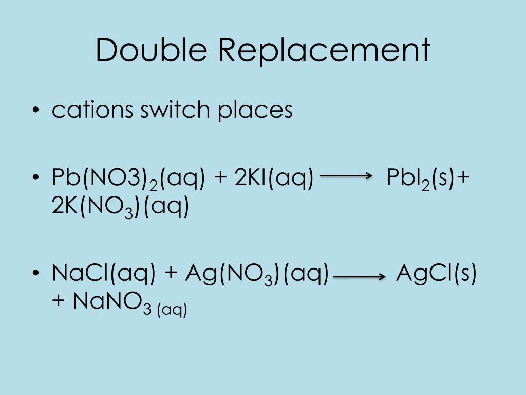 Double Replacement • cations switch places • Pb(NO3)2(aq) + 2KI(aq) PbI2(s)+ 2K(NO3)(aq) • NaCl(aq) + Ag(NO3)(aq) AgCl(s) + NaNO3 (aq)