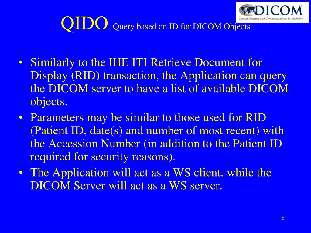 Similarly to the IHE ITI Retrieve Document for Display (RID) transaction, the Application can query the DICOM server to have a list of available DICOM objects. Parameters may be similar to those used for RID (Patient ID, date(s) and number of most recent) with the Accession Number (in addition to the Patient ID required for security reasons). The Application will act as a WS client, while the DICOM Server will act as a WS server. QIDO Query based on ID for DICOM Objects