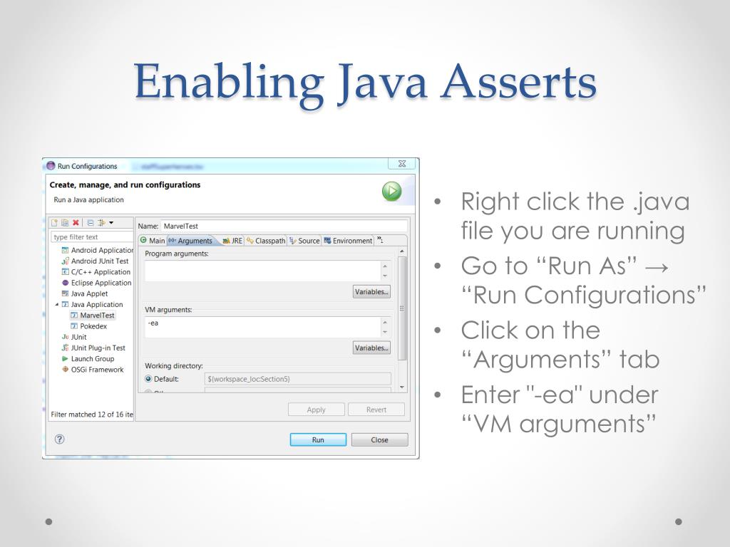 Enabling Java Asserts • Right click the .java file you are running • Go to “Run As” → “Run Configurations” • Click on the “Arguments” tab • Enter "-ea" under “VM arguments”