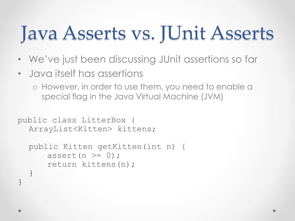 Java Asserts vs. JUnit Asserts • We’ve just been discussing JUnit assertions so far • Java itself has assertions • However, in order to use them, you need to enable a special flag in the Java Virtual Machine (JVM) public class LitterBox{ ArrayList<Kitten> kittens; public Kitten getKitten(int n) { assert(n >= 0); return kittens(n); } }