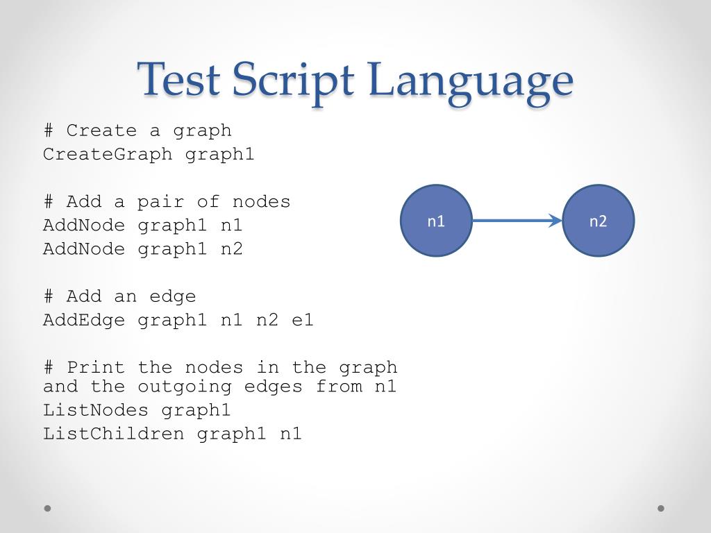 Test Script Language # Create a graph CreateGraph graph1 # Add a pair of nodes AddNode graph1 n1 AddNode graph1 n2 # Add an edge AddEdge graph1 n1 n2 e1 # Print the nodes in the graph and the outgoing edges from n1 ListNodes graph1 ListChildren graph1 n1 n1 n2