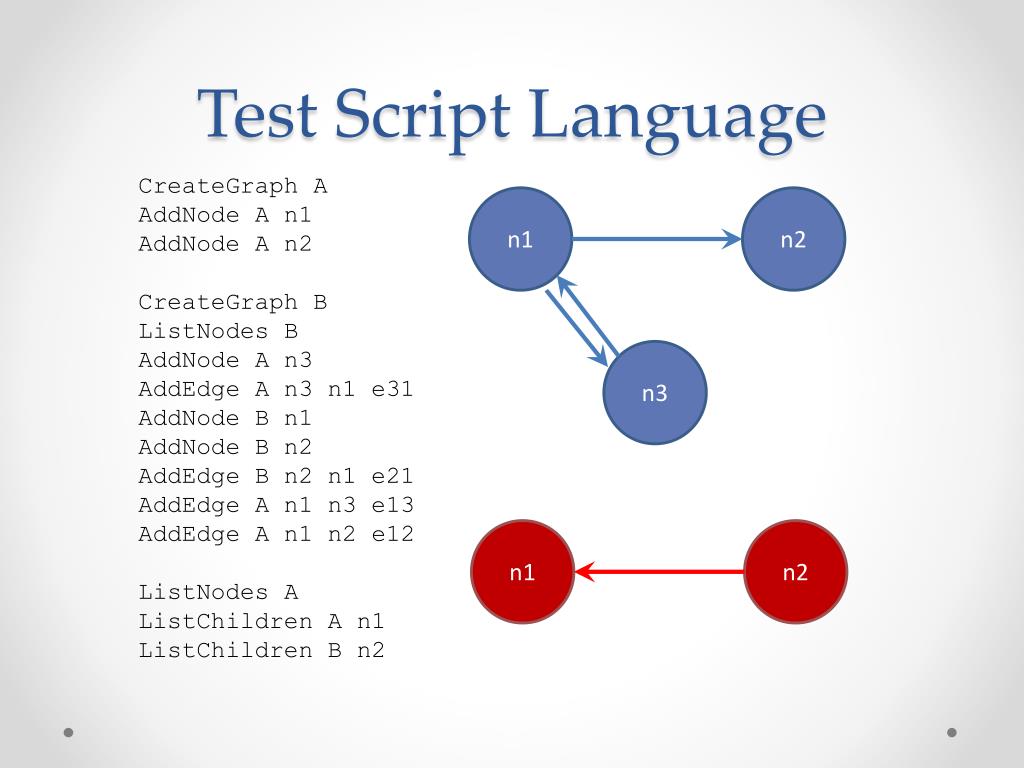 Test Script Language CreateGraph A AddNode A n1 AddNode A n2 CreateGraph B ListNodes B AddNode A n3 AddEdge A n3 n1 e31 AddNode B n1 AddNode B n2 AddEdge B n2 n1 e21 AddEdge A n1 n3 e13 AddEdge A n1 n2 e12 ListNodes A ListChildren A n1 ListChildrenB n2 n1 n2 n3 n1 n2