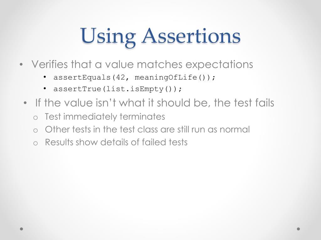 Using Assertions • Verifies that a value matches expectations • assertEquals(42, meaningOfLife()); • assertTrue(list.isEmpty()); • If the value isn’t what it should be, the test fails • Test immediately terminates • Other tests in the test class are still run as normal • Results show details of failed tests