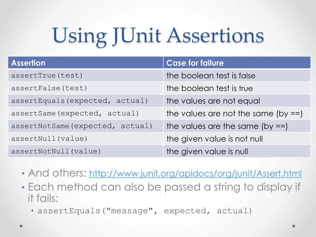 Using JUnit Assertions • And others: http://www.junit.org/apidocs/org/junit/Assert.html • Each method can also be passed a string to display if it fails: • assertEquals("message", expected, actual)