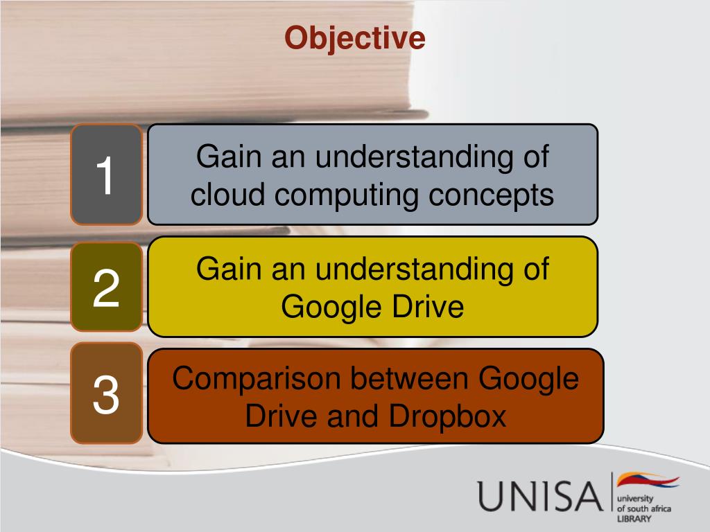 Objective 1 Gain an understanding of cloud computing concepts Gain an understanding of Google Drive 2 3 Comparison between Google Drive and Dropbox