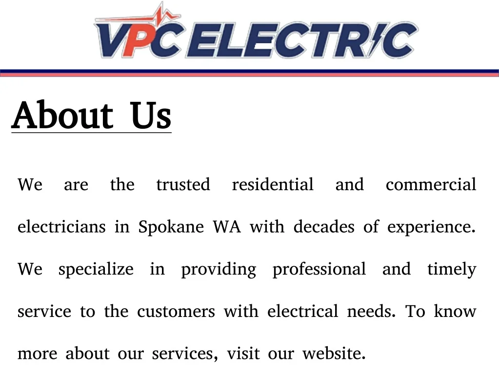 About Us We are the trusted residential and commercial electricians in Spokane WA with decades of experience. We specialize in providing professional and timely service to the customers with electrical needs. To know more about our services, visit our website.