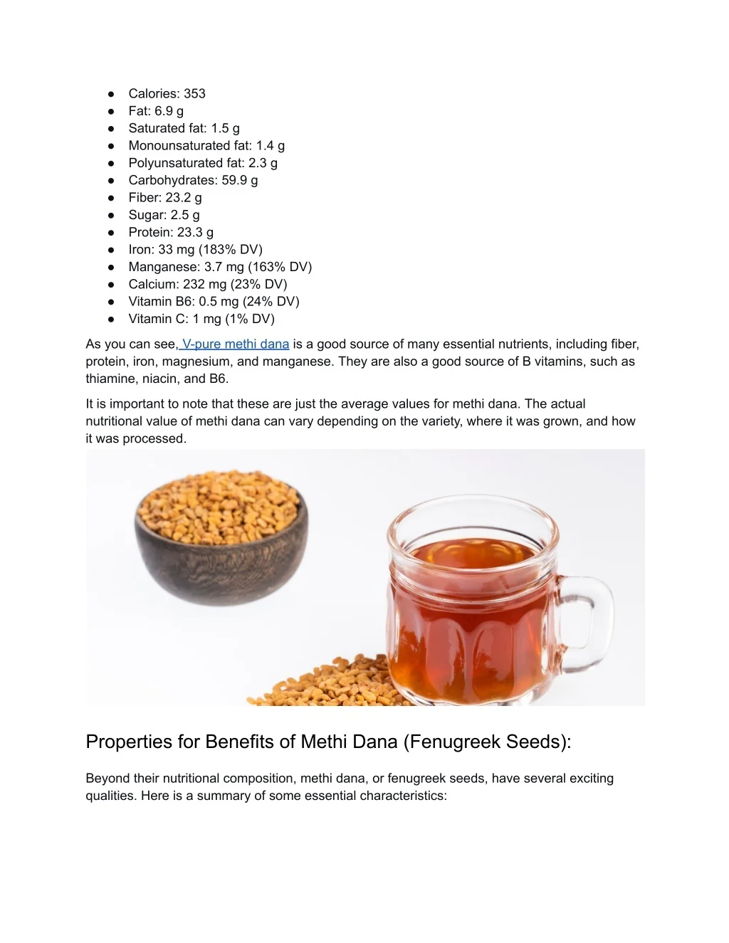 ● ● ● ● ● ● ● ● ● ● ● ● ● ● Calories: 353 Fat: 6.9 g Saturated fat: 1.5 g Monounsaturated fat: 1.4 g Polyunsaturated fat: 2.3 g Carbohydrates: 59.9 g Fiber: 23.2 g Sugar: 2.5 g Protein: 23.3 g Iron: 33 mg (183% DV) Manganese: 3.7 mg (163% DV) Calcium: 232 mg (23% DV) Vitamin B6: 0.5 mg (24% DV) Vitamin C: 1 mg (1% DV) As you can see, V-pure methi dana is a good source of many essential nutrients, including fiber, protein, iron, magnesium, and manganese. They are also a good source of B vitamins, such as thiamine, niacin, and B6. It is important to note that these are just the average values for methi dana. The actual nutritional value of methi dana can vary depending on the variety, where it was grown, and how it was processed. Properties for Benefits of Methi Dana (Fenugreek Seeds): Beyond their nutritional composition, methi dana, or fenugreek seeds, have several exciting qualities. Here is a summary of some essential characteristics: