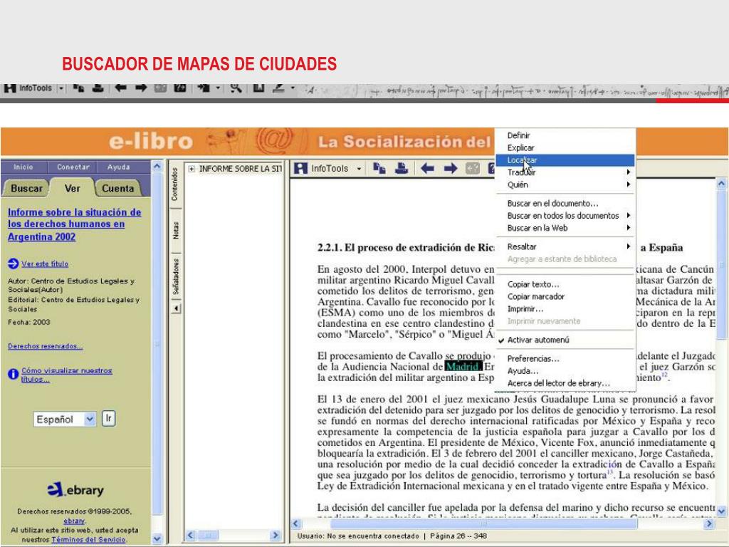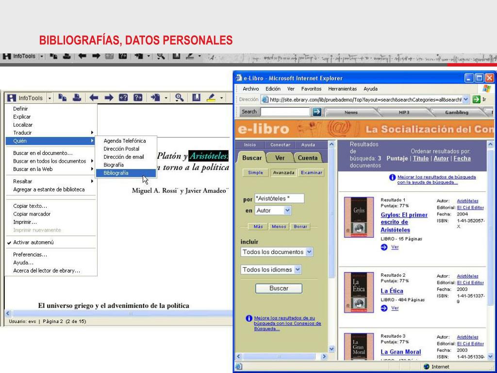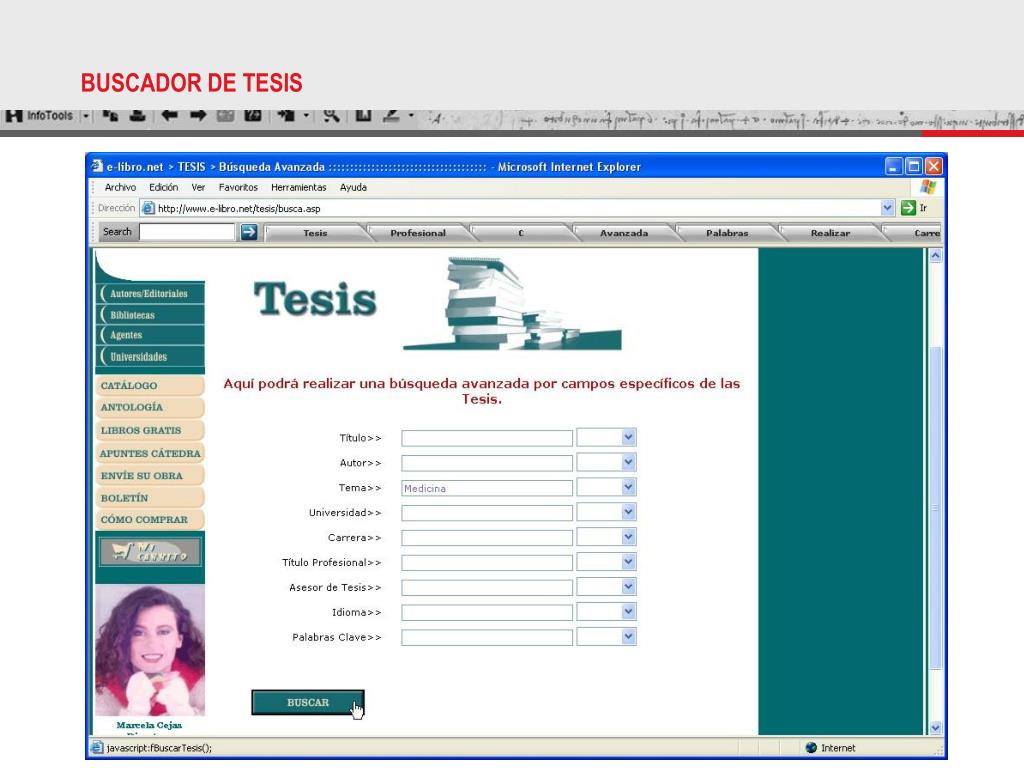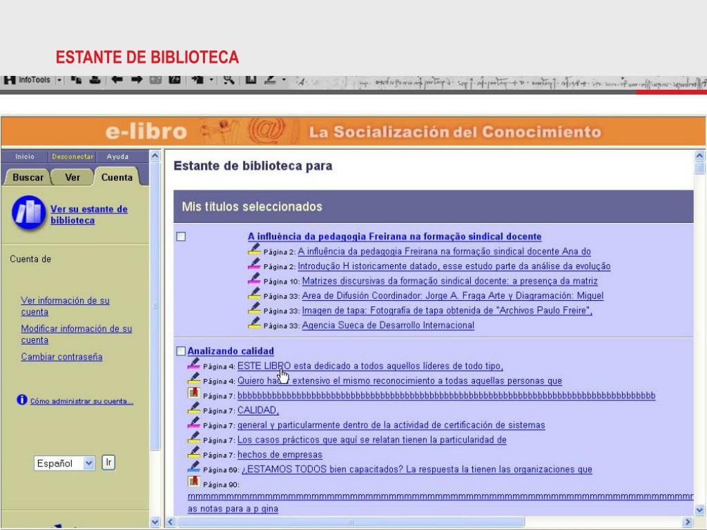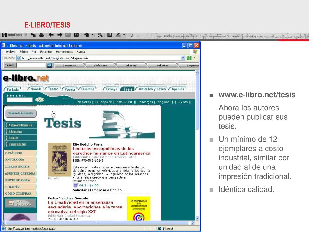 Libros en castellano, portugués e inglés Herramientas de aprendizaje, InfoTools Revistas Cientificas IaP (impreso a pedido) Apuntes de cátedra Tesis On line y download www.e-libro.com www.e-libro.net/tesis www.e-livro.com