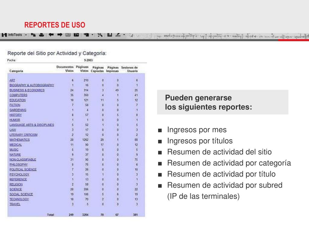 REPORTES DE USO Pueden generarse los siguientes reportes: ■ Ingresos por mes ■ Ingresos por títulos ■ Resumen de actividad del sitio ■ Resumen de actividad por categoría ■ Resumen de actividad por título ■ Resumen de actividad por subred (IP de las terminales)